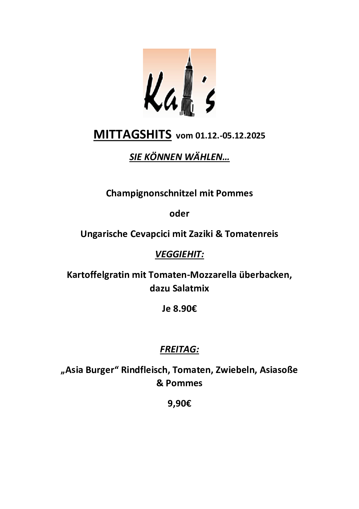 Auf unserer Speisekarte finden Sie leckere Gerichte und Spezialitäten der Saison. Mittags bieten wir wöchentlich wechselnde Mittagshits.